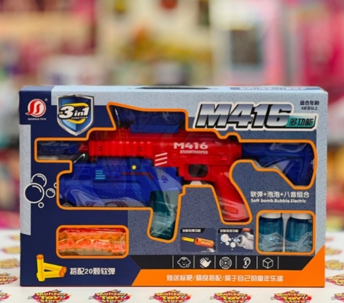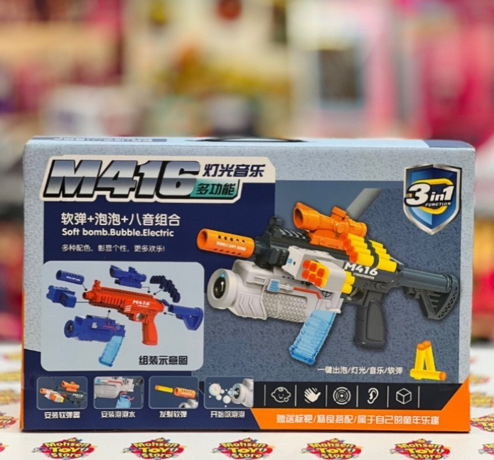 تفنگ چندکاره حباب ساز ، تیر ژله ای و موزیکال M416 دارای ظاهر فانتزی و بسیار جذب با رنگهای شاد و کودک پسندی است.